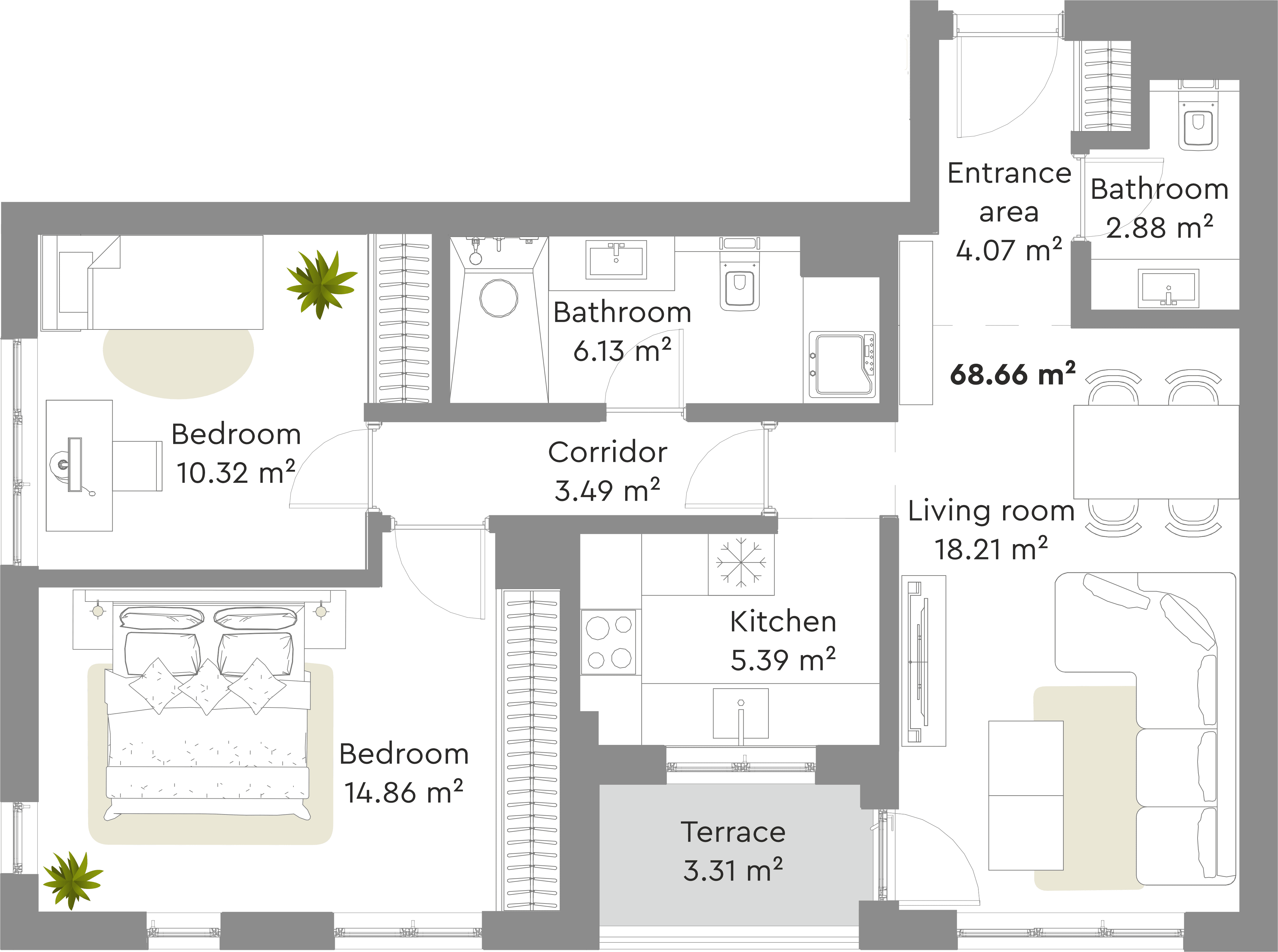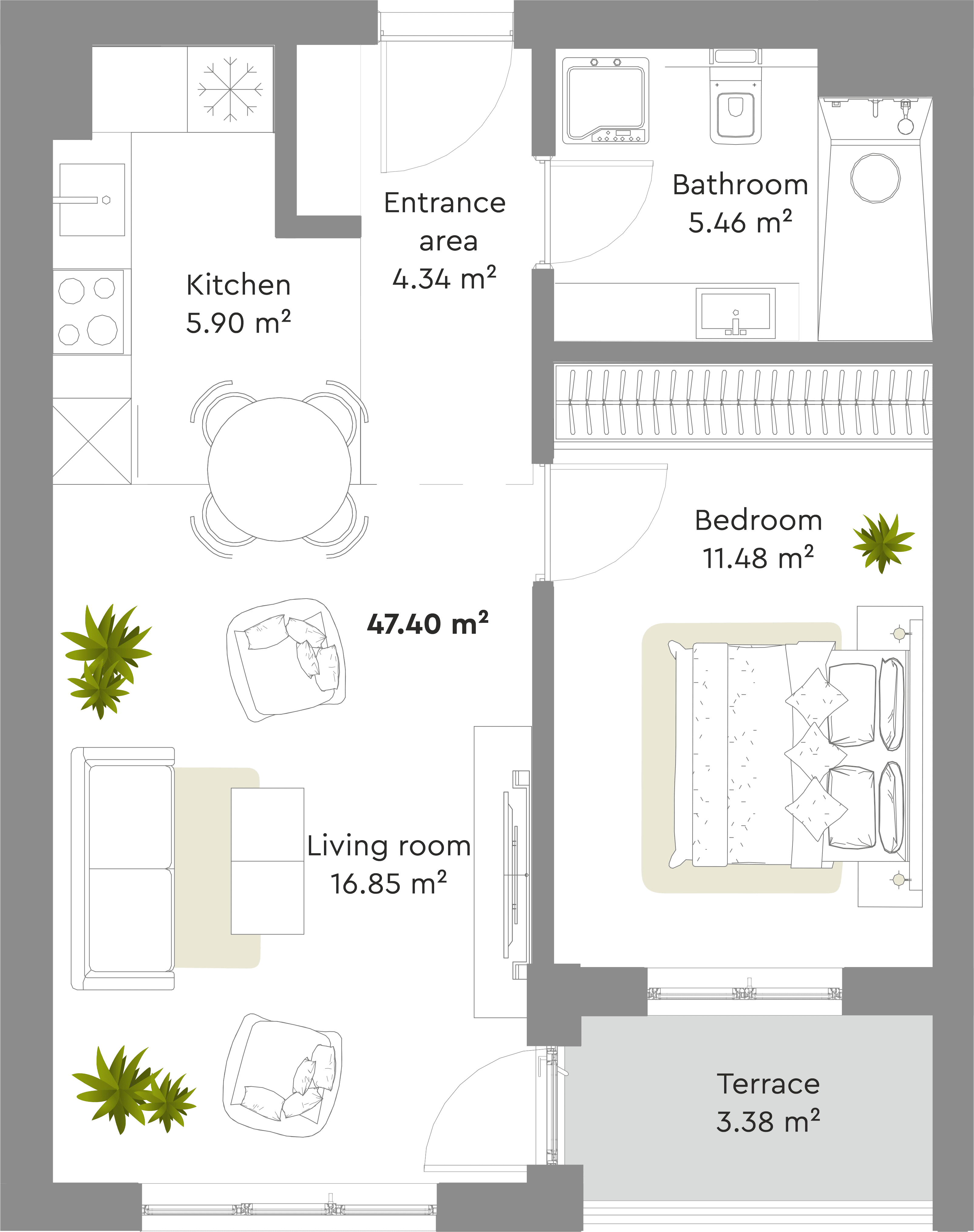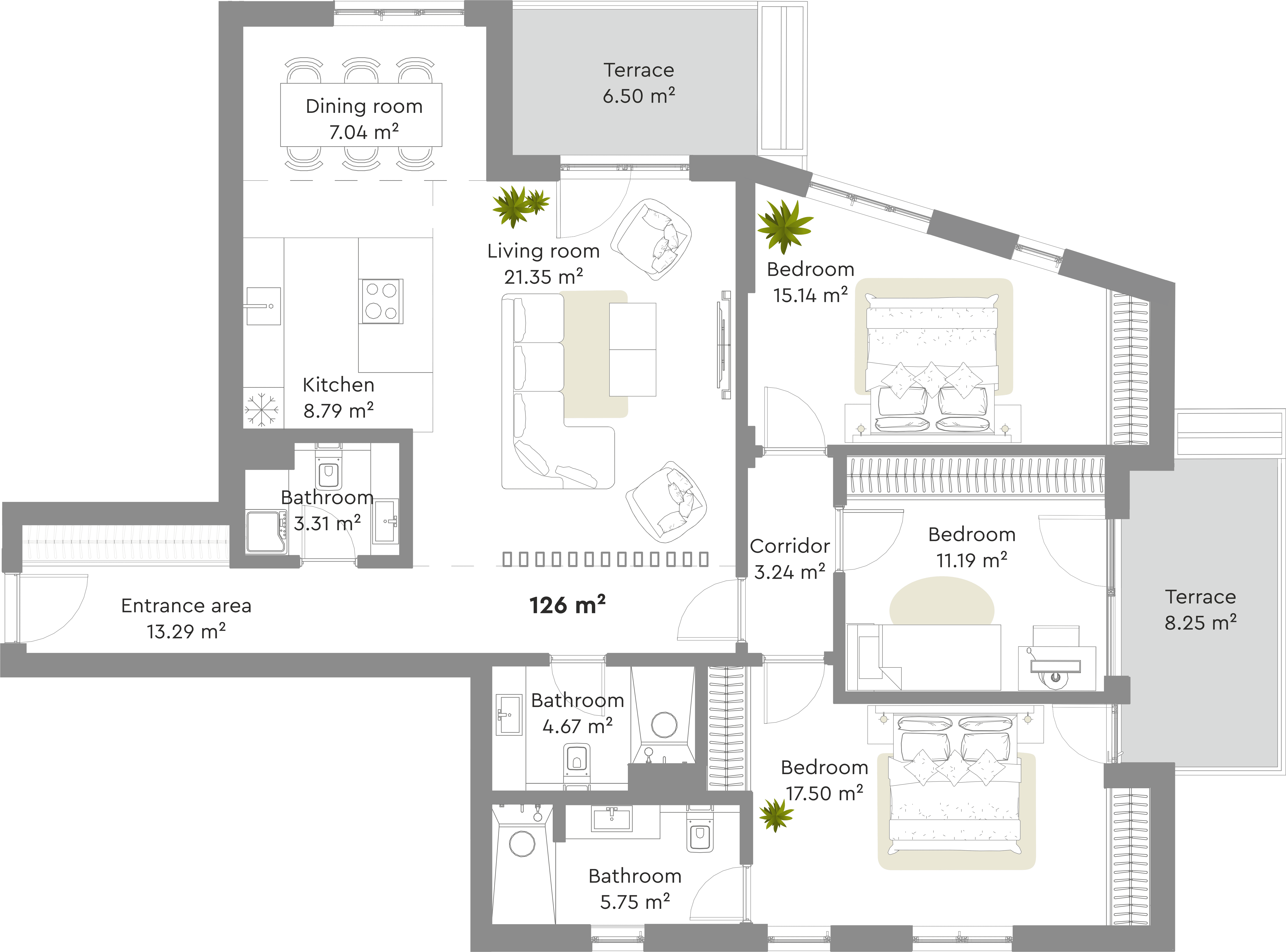 Terase naših stanova su prostrane, površine do 8 m2, osvetljene i sa velikim prozorima. Pravo su mesto da se izađe na čist vazduh i opusti uz šoljicu kafe.